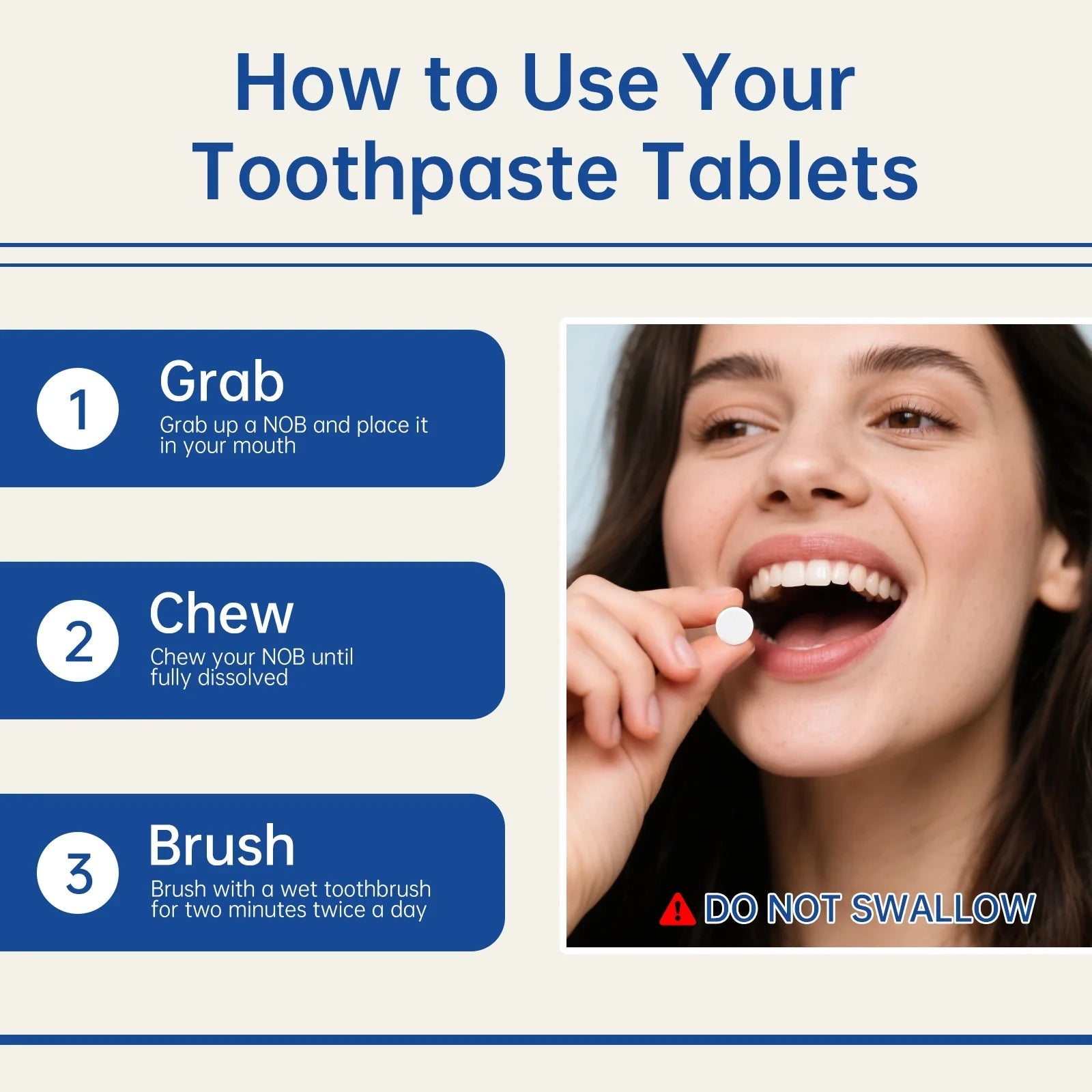 Simply chew one tablet, brush with a wet toothbrush for 2 minutes, then rinse. Each tablet provides the perfect amount for effective cleaning.